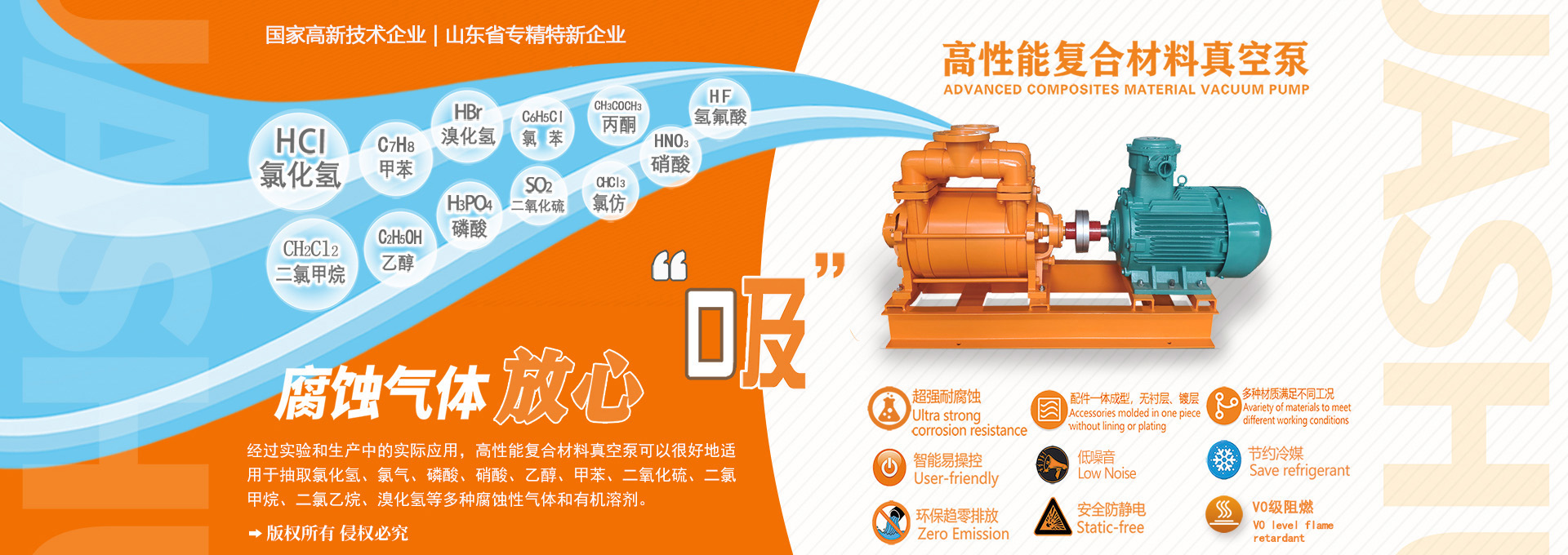 淄博華舜耐腐蝕真空泵有限公司所生產(chǎn)的防腐水環(huán)泵,防腐蝕水環(huán)泵,耐腐蝕水環(huán)泵等產(chǎn)品,產(chǎn)品過流部件采用三大系列高性能復(fù)合材料(HS-V130、HS-V110、HS-V80)一體成型,耐腐蝕范圍廣、無襯層不脫落、節(jié)能效率高、運行可靠、環(huán)保節(jié)水、 體積小、重量輕、使用壽命長等特點。 淄博華舜耐腐蝕真空泵有限公司是一家集科研開發(fā)、設(shè)計咨詢、生產(chǎn)、銷售、服務(wù)于一體,利用新型高性能復(fù)合材料,專業(yè)生產(chǎn)耐腐蝕液環(huán)真空泵的國家高新技術(shù)企業(yè), 坐落于“中國泵業(yè)名城”---山東省淄博市博山區(qū),公司通過了ISO9001質(zhì)量體系認(rèn)證。公司獨立研發(fā)的具有多項自主知識產(chǎn)權(quán)的專利產(chǎn)品-耐腐蝕系列水環(huán)式真空泵,通過了省級科技成果鑒定,處于“國際先進(jìn)水平”。 在全體員工的共同努力下,公司榮獲國家高新技術(shù)企業(yè)、科技創(chuàng)新示范企業(yè)、創(chuàng)新型優(yōu)秀新產(chǎn)品一等獎、科技型中小企業(yè)、山東省“專精特新”企業(yè)、省級一企一技術(shù)研發(fā)中心、淄博市專利獎、高價值專利獎、山東省民營經(jīng)濟(jì)知名品牌等榮譽稱號。2021年與山東大學(xué)聯(lián)合成立海洋耐腐蝕材料聯(lián)合實驗室及裝備產(chǎn)學(xué)研合作基地。